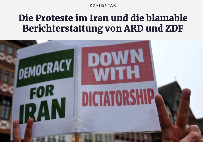 Die Frage unserer Leserin bezieht sich auf einen Kommentar in der „Jüdischen Allgemeinen“, den auch „Bild“ später aufgriff. Er trägt den Titel: „Die Proteste im Iran und die blamable Berichterstattung von ARD und ZDF“.