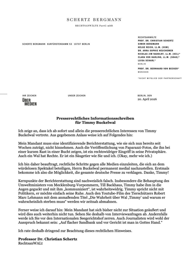 Timmy hat es offenbar satt. Nach wochenlanger Belagerung durch Reporter und Kamerateams wird der Buckelwal nun vom prominenten Berliner Medienanwalt Christian Schertz vertreten. Das teilt Schertz in einem seiner bis tief in den Atlantik gefürchteten „presserechtlichen Informationsschreiben“ mit. Wir dokumentieren es exklusiv.